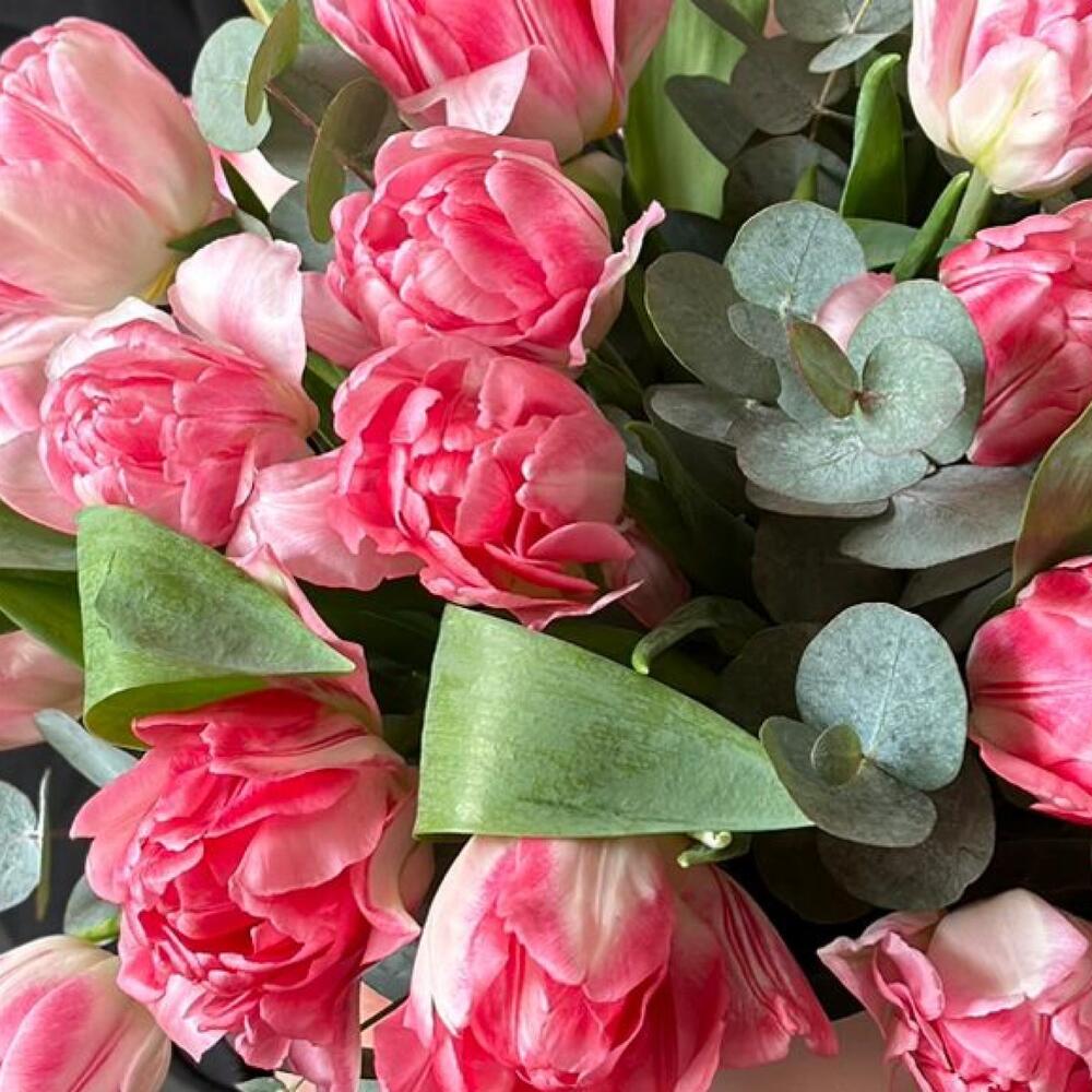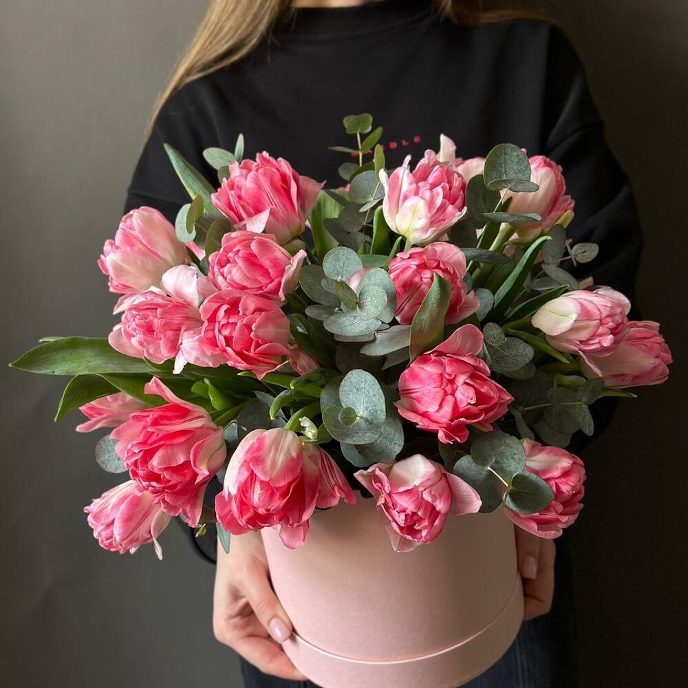 охапка пионовидных тюльпанов в шляпной коробке – отличный презент для ваших любимых
